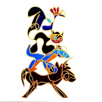 Un alegre caballo de raza “sangre fría” se dirige, en línea diagonal, hacia el observador. Este trabajo es ejemplo de equilibrio entre un estilo cubista, aire infantil y el “naif”