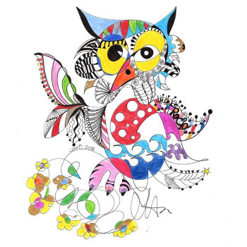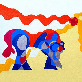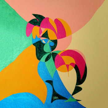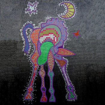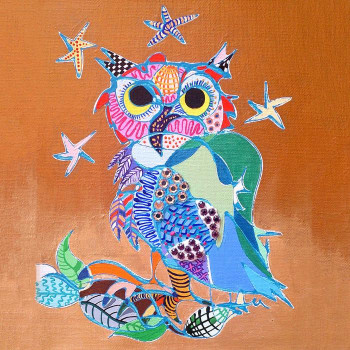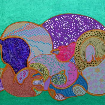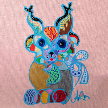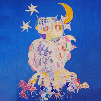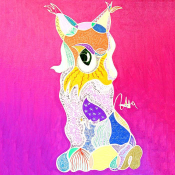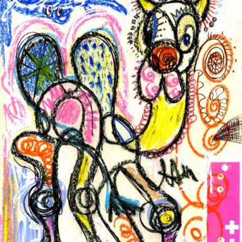 Obra de suaves líneas cubistas, colores “pastel”. Un osito de juguete de color plata, dialogando con símbolos en parte abstractos, de flores, ojos, gafas, labios, estrellas.