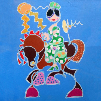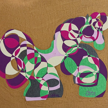 En 2015, la artista realiza varios estudios de caballos, con línea muy fluida y sectores minuciosamente divididos. Tanto el juego con lunares de diferentes colores fuertes y metalizados como el fondo dividido en varias partes desiguales, resaltan el movimiento desenfadado y orgulloso de un potro PRE.