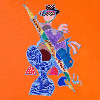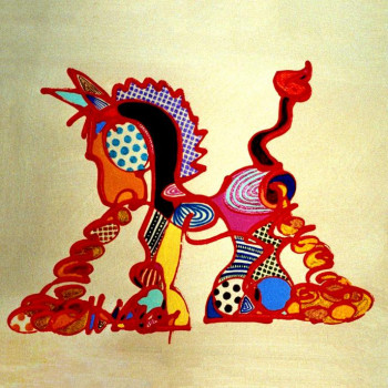 Sobre un fondo blanco titanio, Uta boceta en un solo trazo de numerosos círculos enredados, una yegua rampante cuyos tonos rojos llaman toda la atención. La artista opta por firmar esta obra sobria de pequeño formato en el dorso del lienzo.