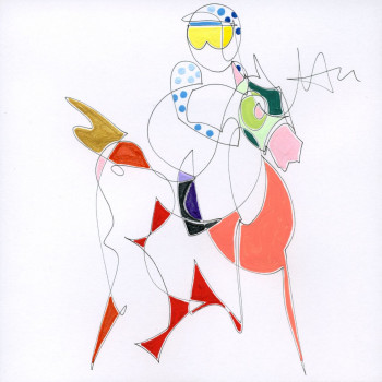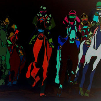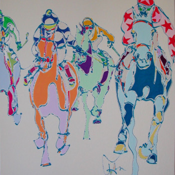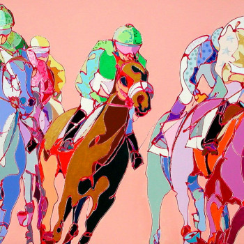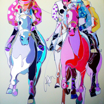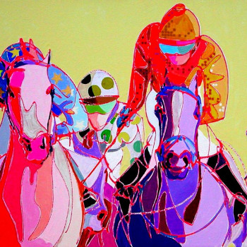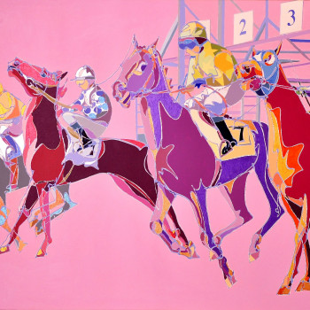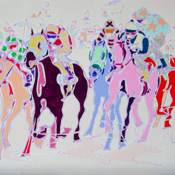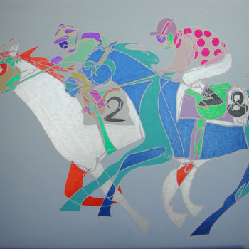 En 2006, la artista sigue bocetando las Carreras de Caballos de su nueva tierra. Ninguno de los dos jinetes protagonistas presta atención al observador, sino a los últimos preparativos para la inminente carrera. El público contemplador se centra detrás de las vallas y hace sentir al observador de la obra como uno de ellos.