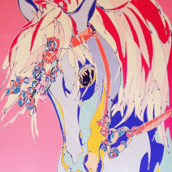 Para su juego atrevido con colores del Pop Art, la artista usa un boceto de caballo de Pura Raza Española (PRE), sobre un fondo rosa palo.