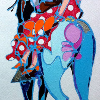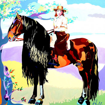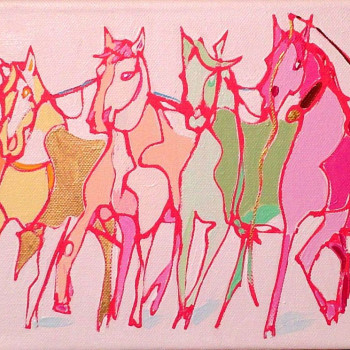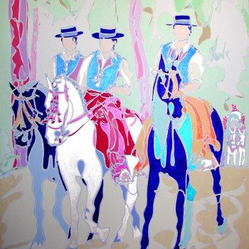 Cubista impresión de tres yeguas de la raza PRE, relajadas e curiosas Aunque la artista hace de cada una creatura multicolor, se intuye que la primera es de color blanca y las dos en segundo y tercer plano de color oscuro.