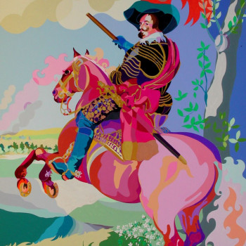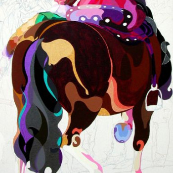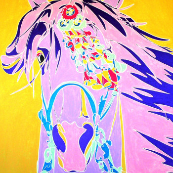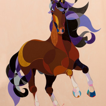 Para su juego atrevido con colores del Pop Art, la artista usa un boceto de caballo de Pura Raza Española (PRE), sobre un fondo berenjena pastel.