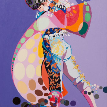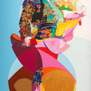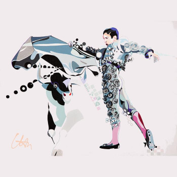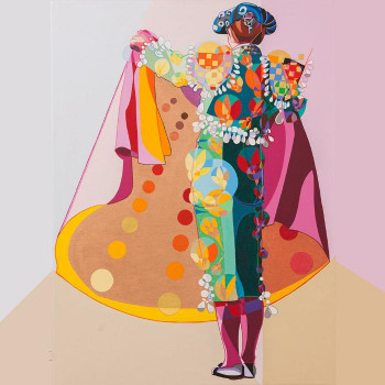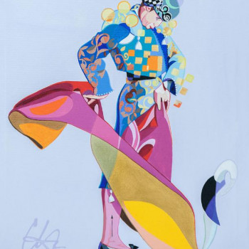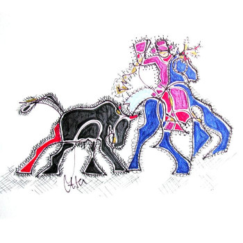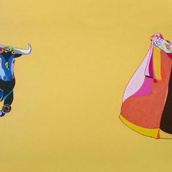 En un solo trazo azul realiza la artista el boceto de esta escena con muleta. El colorido fuerte de la escena contrasta con un fondo en tonos pasteles que muestra unas gradas llenas.