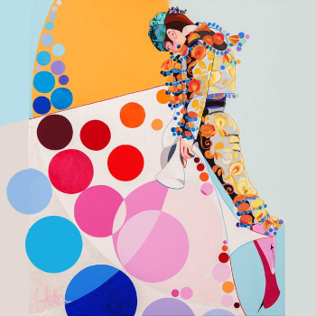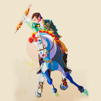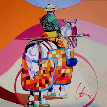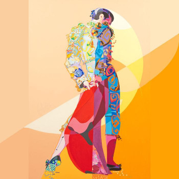 Un torero arrodillado, con capote en movimiento dinámico. La composición de un estilo cubista con el llamativo colorido del Pop Art hace de esta pequeña escena taurina la perfecta pincelada del estilo de Uta.