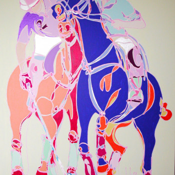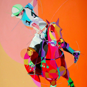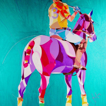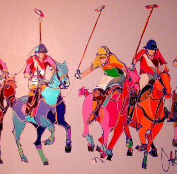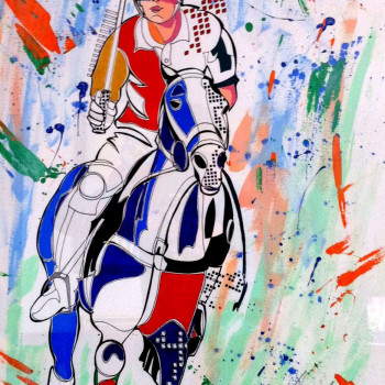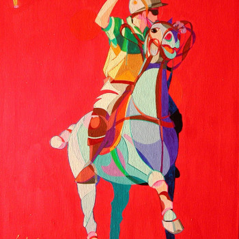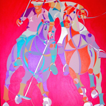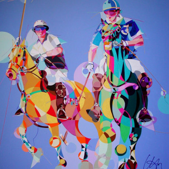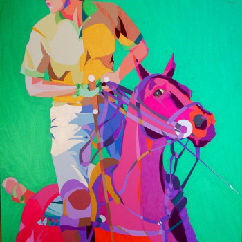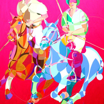 Realizado de forma cubista, el lienzo muestra un duelo de dos jinetes de Polo, su mirada está puesta fijamente en un punto fuera del lienzo. En el fondo, parte superior de la obra un jinete solitario, en tonos discretos, insinuando la larga tradición de este exclusivo deporte.